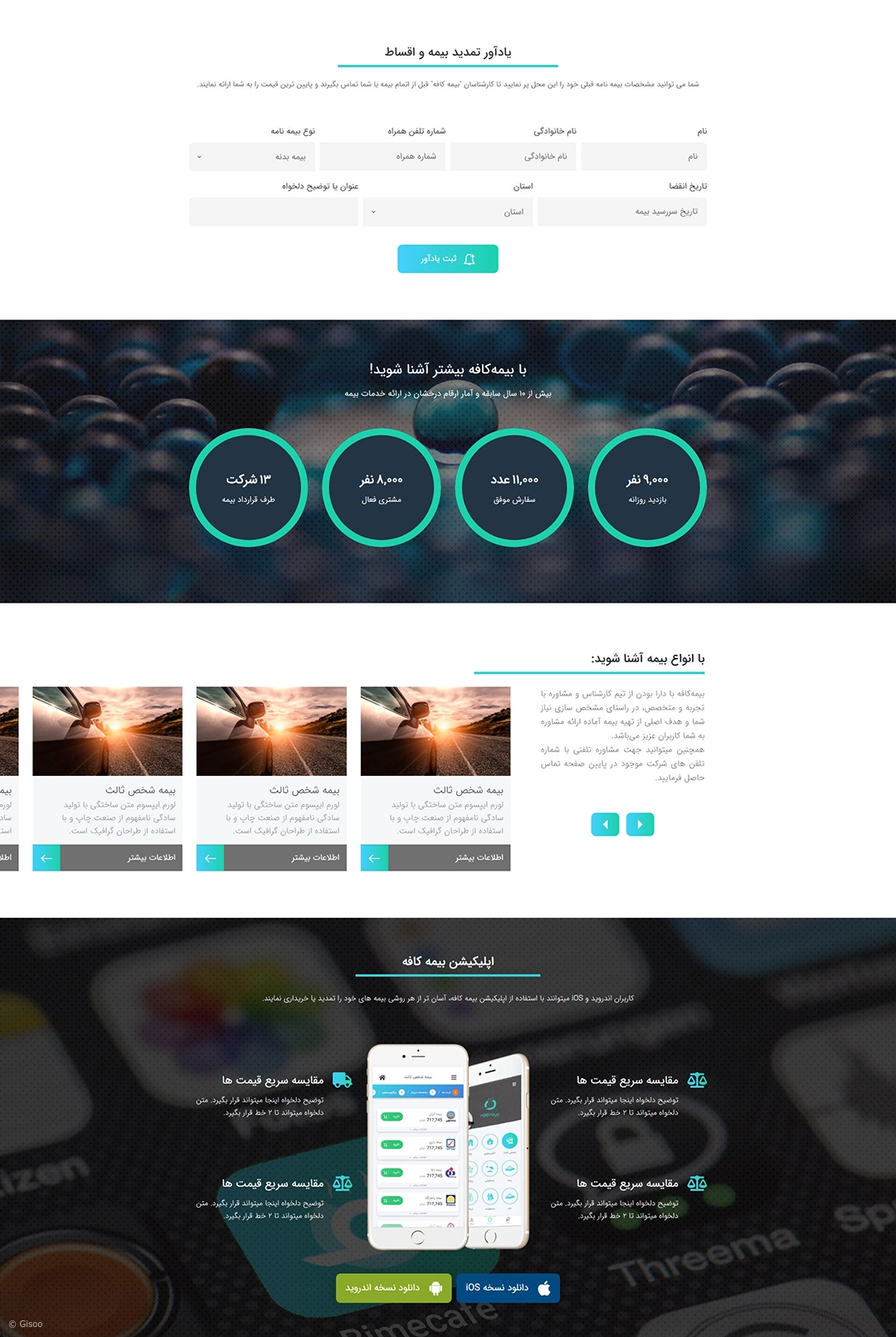 سیستم اختصاصی فروش آنلاین بیمه گیسو (نسخه قدیم) در این پروژه استفاده شده و کدنویسیها و برنامهنویسی آن بر بستر فریمورک لاراول انجام شده است. مشاوره انتخاب دامنه، خدمات میزبانی وب (هاستینگ) و ثبت دامنه توسط گیسو ارائه شده است. اگر شما نیز نمایندگی شرکت بیمهای را دارید با ما تماس بگیرید تا وبسایت یا اپلیکیشن اختصاصی خود را داشته باشید.